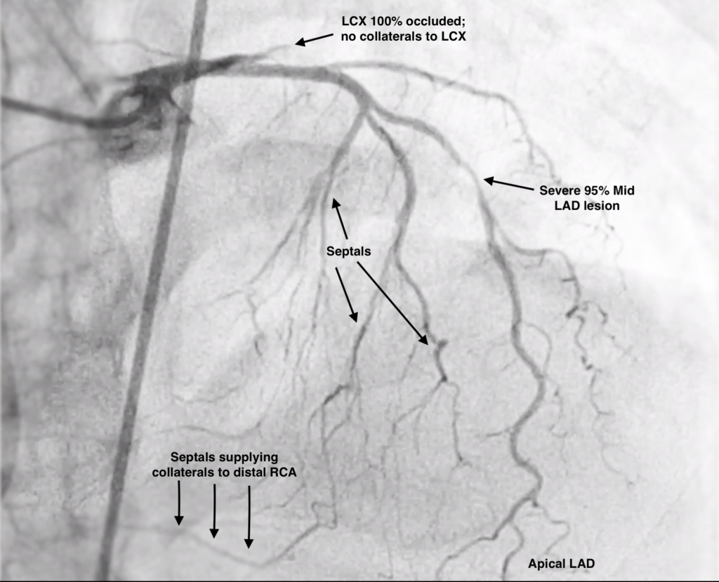 The first step in interpreting this angiogram is to orient yourself. This is a RAO Cranial projection. There are large septals coming across the screen indicating the LAD is the main vessel we see. Sometimes it can be challenging to even accurately identify the LAD, especially when the septal branches are larger in size. In this case, there is a large septal almost masquerading as an LAD, but the only true vessel that goes to the apex is to the right so that is the LAD. A key finding is to observe that the LAD septal branches are filling the right coronary artery distally so the RCA has a total occlusion.