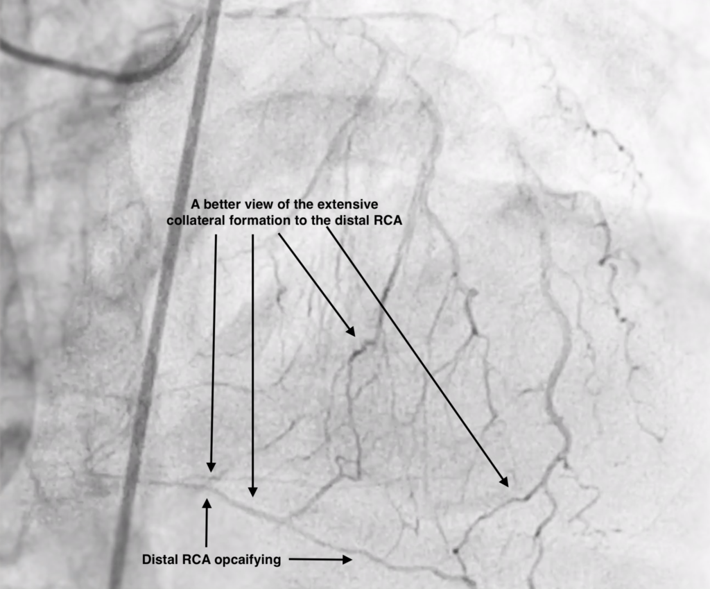 In situations such as this, it can be challenging to identify what the culprit lesion is. It is important to review the clinical information you have at hand, such as the patient’s electrocardiogram and echocardiogram if you have one. Collateral formation can help you tease apart acute vs chronic lesions such as in this angiogram.